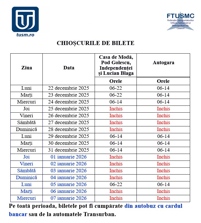 🪪 A jegypénztárak (Divatház, Golescu híd, Independenței sugárút és Hegyi út) nyitvatartása: