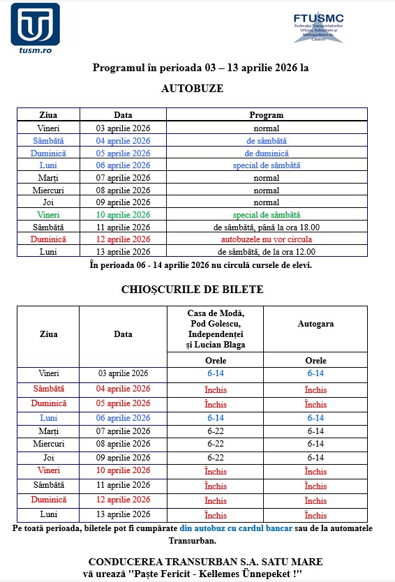 PROGRAMUL AUTOBUZELOR TRANSURBAN S.A. SATU MARE ÎN PERIOADA 3 APRILIE – 13 APRILIE 2026: